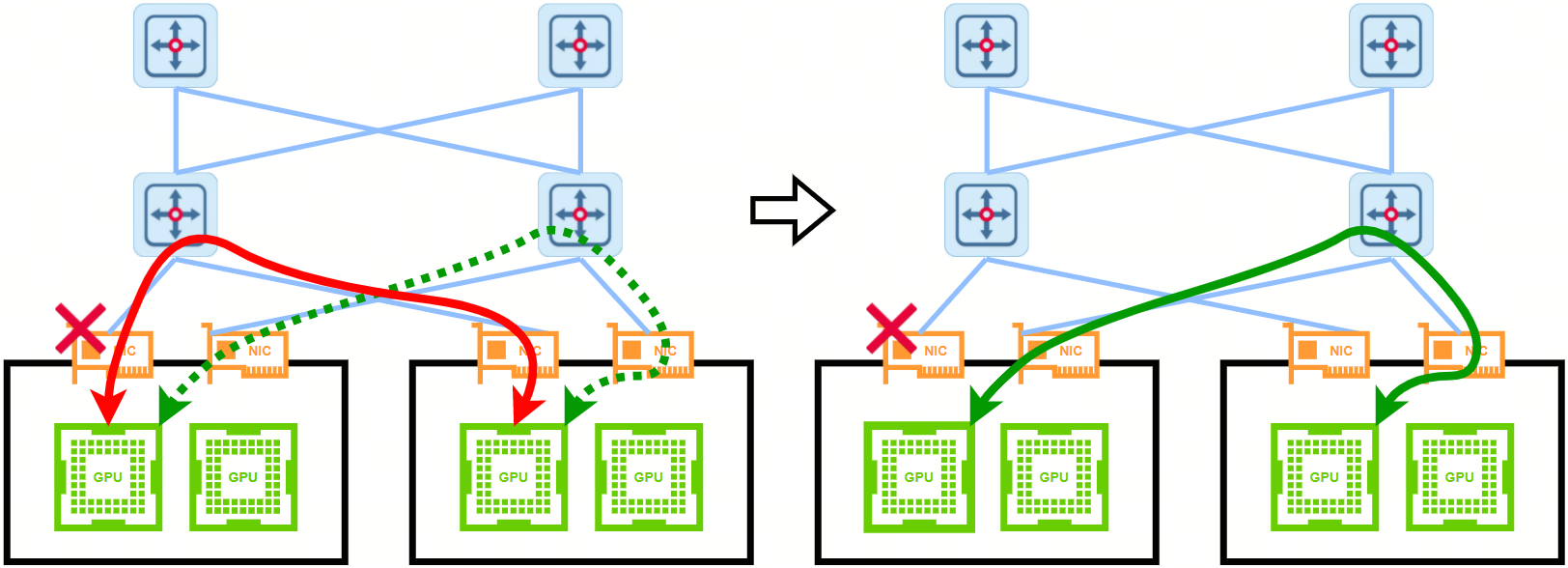 锐捷网络的端侧链路故障逃生是一种基于NCCL(NVIDIA Collective Communications Library)实现的端侧链路故障快速规避方案,能够在上层训练框架无感知的情况下,自动对端侧链路故障进行识别并处理,在模型训练过程中发生端侧链路故障时能够保持训练不中断,在故障设备完成修复后训练性能自动恢复。