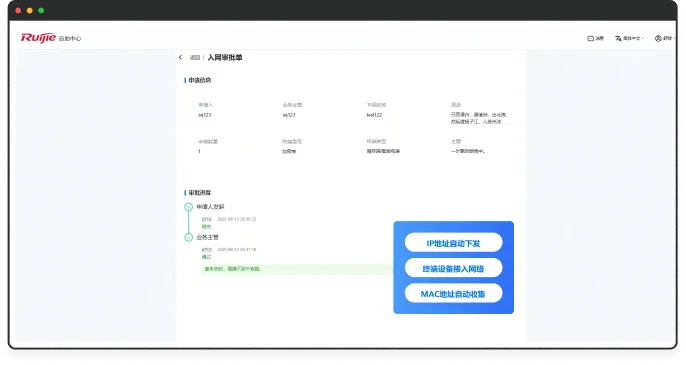 支持专网公共哑终端入网自助申请与审批,IP地址自动下发,MAC地址自动收集,实现哑终端便捷、安全入网