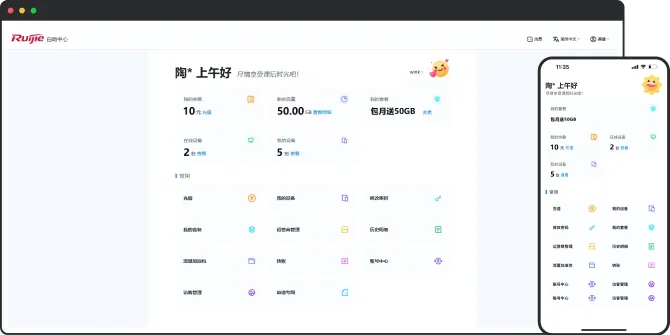 Portal认证页面、自助管理页面二合一,一站式自助上网。自助管理页面与认证平台打通,网络认证成功后,自助管理页面无需单独认证。新增移动端自助管理页面,随时随地使用终端下线功能,终端管理更便捷。