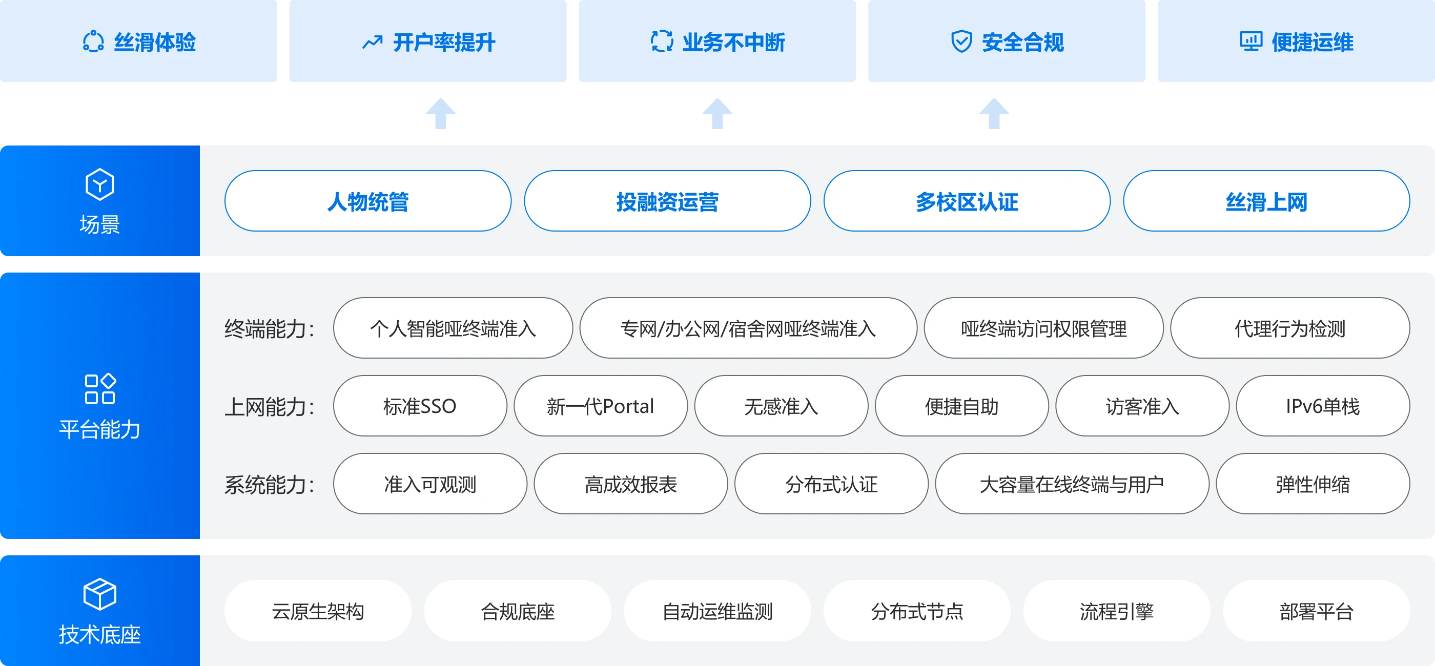 以AI重构校园网准入,实现无感认证体验+全终端智能管理+高可靠架构,助力高校打造安全、便捷、无边界的智慧网络。