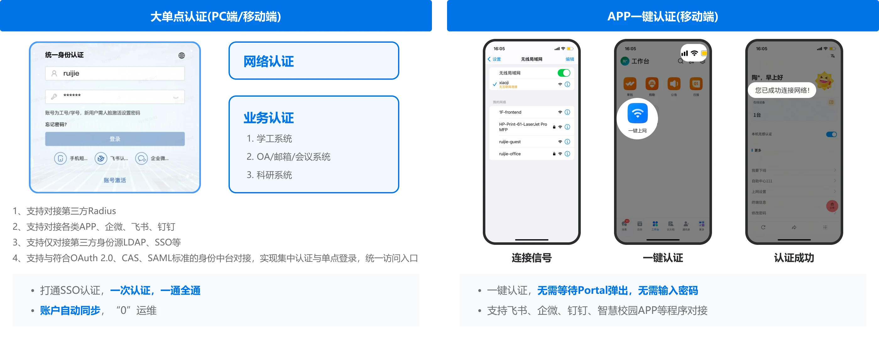 支持PC端/移动端大单点认证、移动端APP一键认证等全新认证方式,实现终端快捷入网。