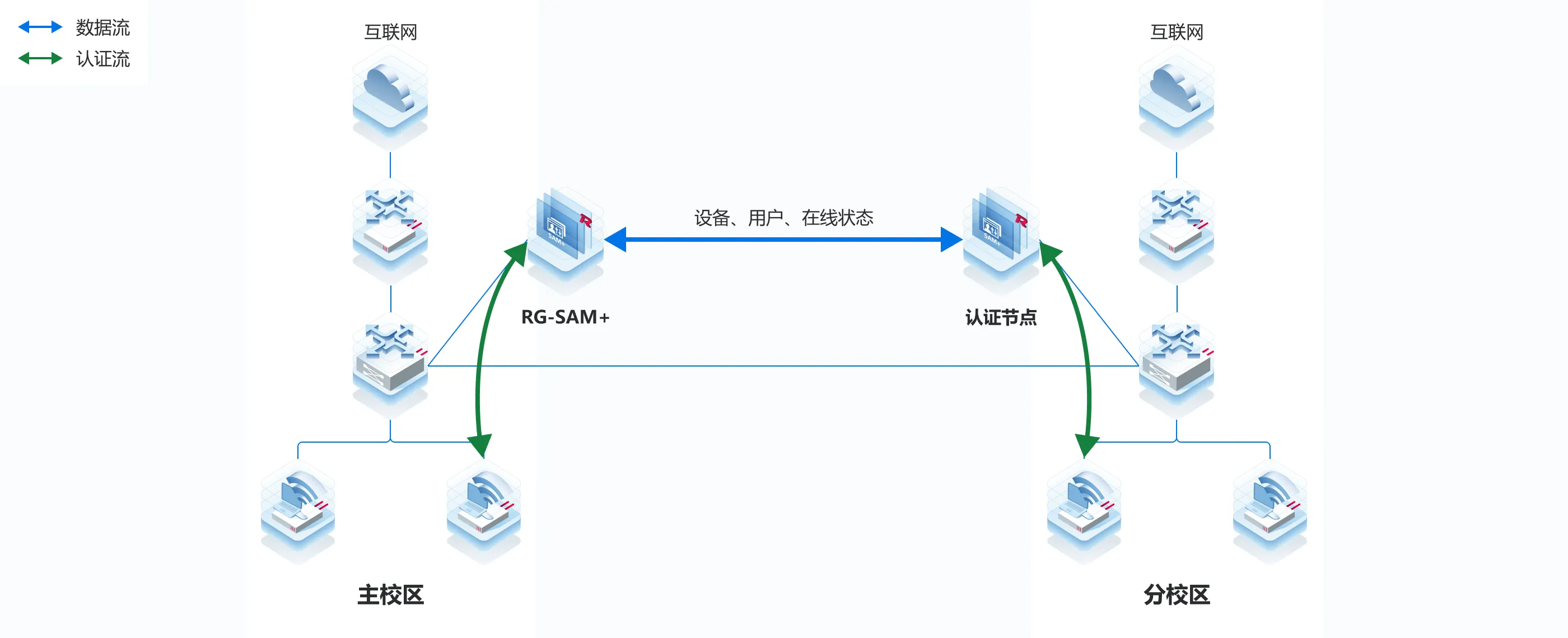 采用分布式认证技术,在主校区部署一套认证系统,分校区仅需部署认证节点,节约成本;支持主分校区相互同步设备、用户、在线状态等数据